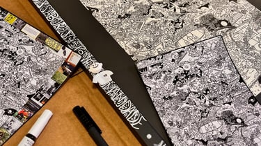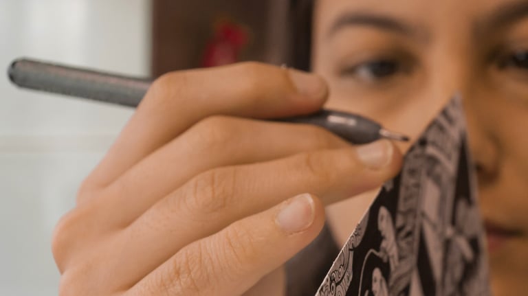 Os desenhos são feitos à mão, canetas à base de nanquim.